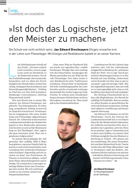 In der aktuellen Oktober-Ausgabe berichtet das Magazin NordHandwerk über unseren Fliesenleger Jan.